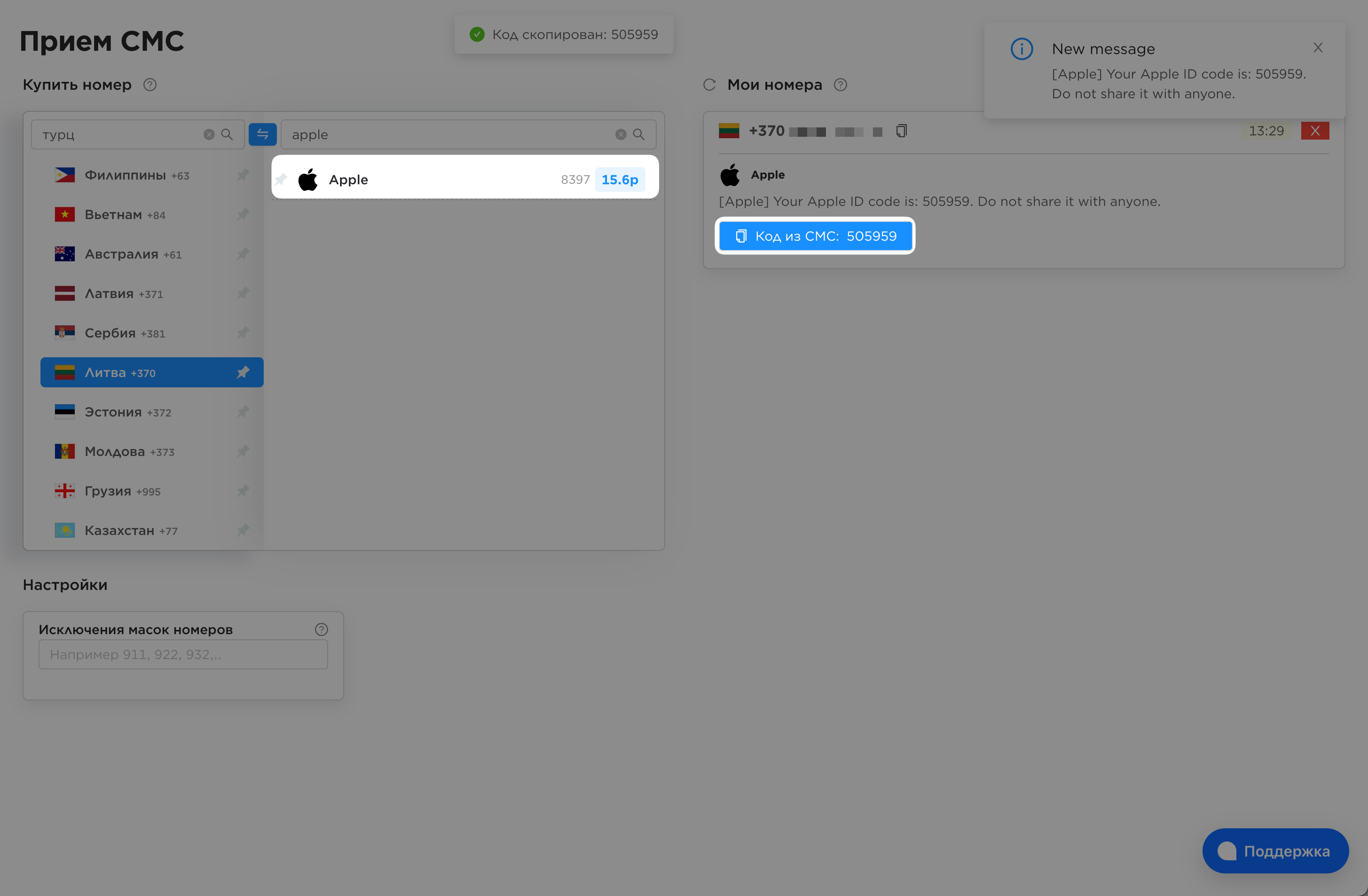 Сервисы аренды виртуальных номеров — это онлайн-платформы, которые дают временный доступ к телефонным номерам разных стран. Вы арендуете номер на 10–20 минут, получаете SMS с кодом от Apple и создаете аккаунт. Виртуальный номер стоит от 10 до 200 рублей в зависимости от страны и сервиса.
