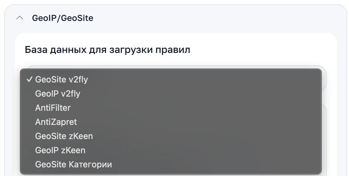 В готовый пресет включены все основные заблокированные сервисы. Дополнительная информация про базы: zkeen domians и zkeen ip. Другие GEO параметры являются альтернативой. Вы можете выбрать необходимые. Здесь можно узнать больше про v2fly.