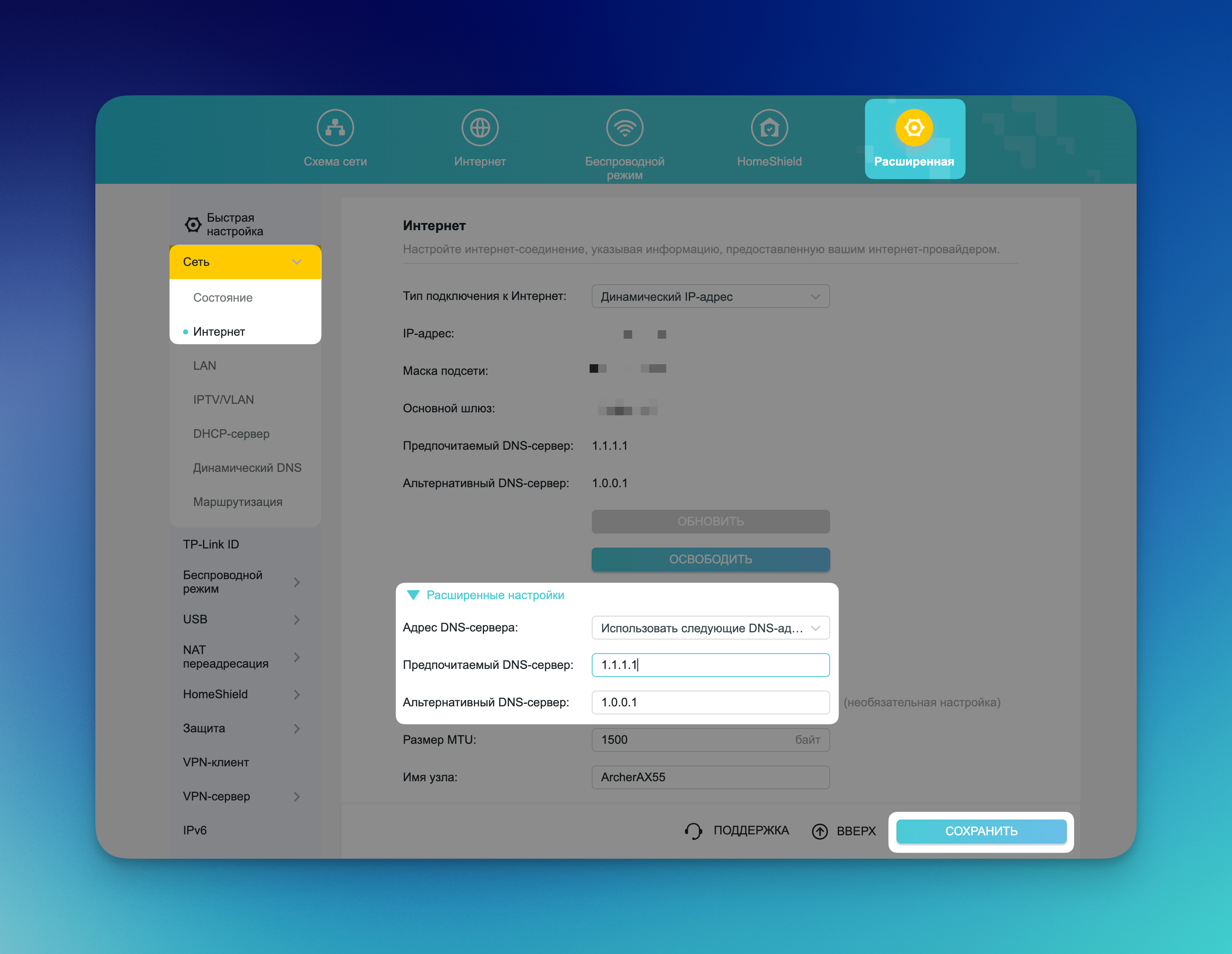 На странице веб-конфигуратора перейдите в раздел Расширенная → Сеть → Интернет.