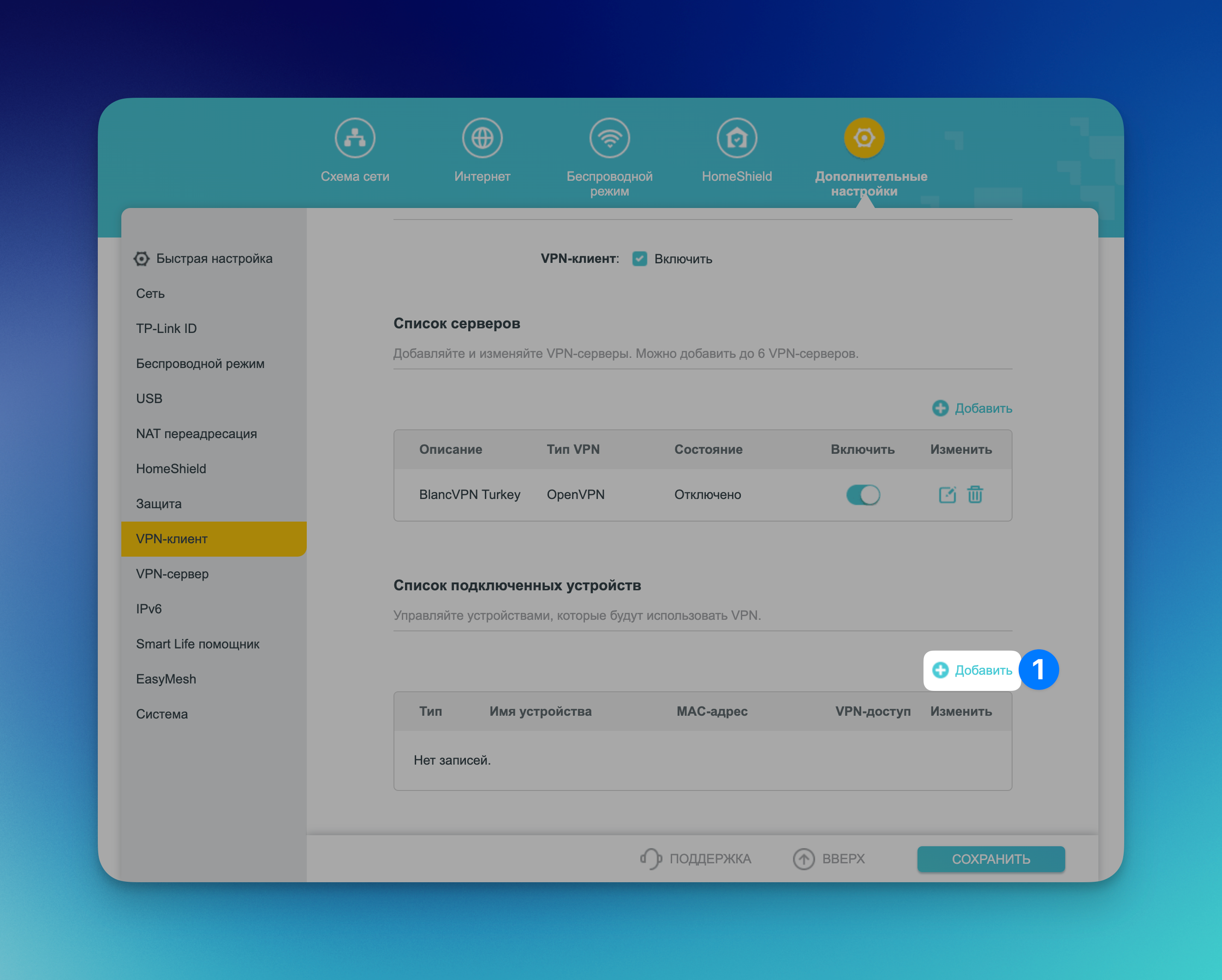 Войдите в личный кабинет. Нажмите Установить → выберите устройство → Другой VPN-клиент → перейдите к инструкции → TP-Link → в графе Локация и протокол выберите WireGuard и локацию → сохраните нужное количество файлов конфигурации .conf.